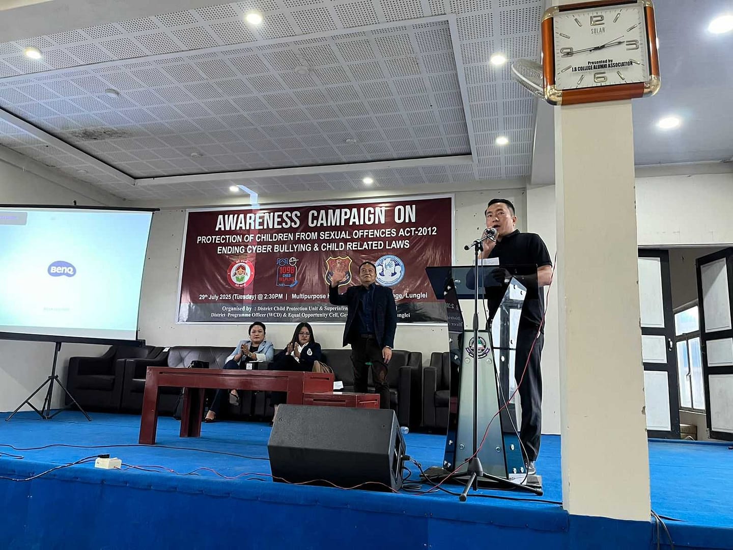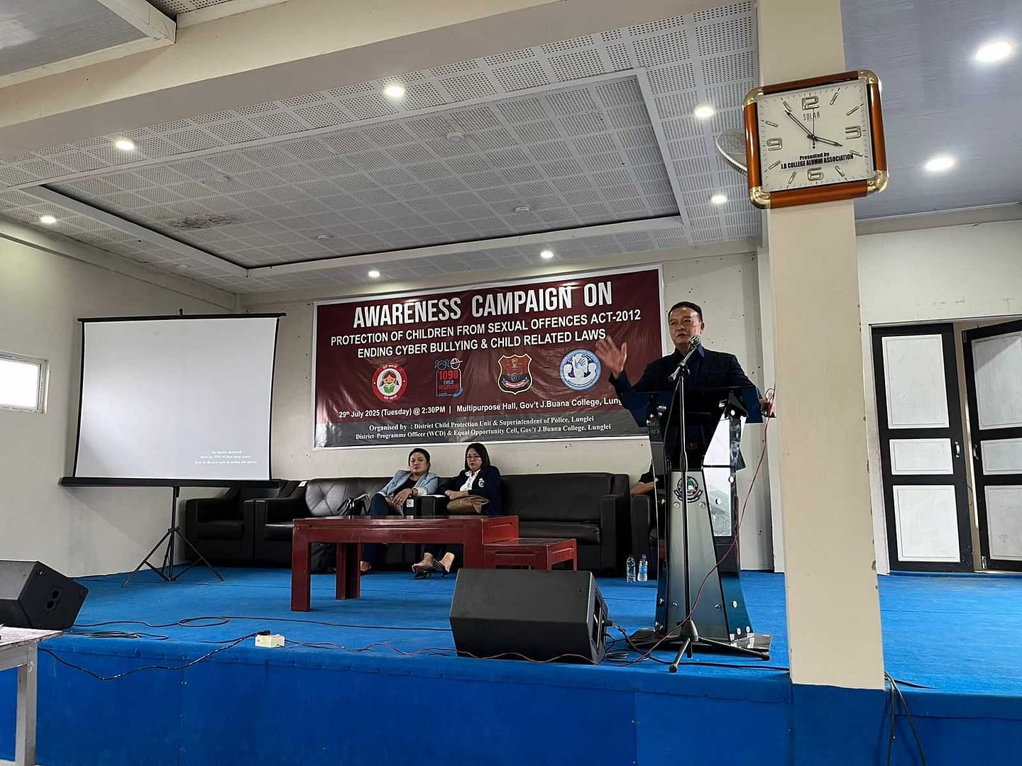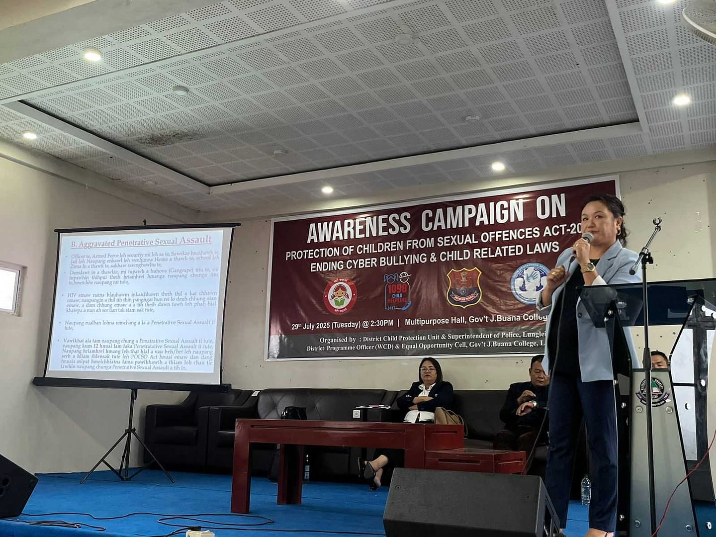 Vawiin (Dt.29.7.2025)  chawhnu khan Govt.J Buana College, Lunglei ah Protection of children from sexual offences act 2012, Ending cyber bullying leh child related laws te zirhona neih a ni. He zirhona hi District Child Protection Unit, Lunglei, Superintendent of Police, Lunglei, District Programme Officer(WCd) leh Equal Opportunity Cell, GJBC te tanghova buatsaih a niin Pu David Zaitinvawra, DCPO Lunglei chuan zirlai naupang te hriattur hrang hrangte, mizo mipa te tan lak a tul zia leh damdawi hmansual kawngah thalai te kan fimkhur a tul hle a ni tiin Naupang venhim kawnga tan lakpui turin zirlai naupang kalkhawm te a sawm. He hunah hian Pi S Lalrotluangi, LPO, DCPU Lunglei chuan hursualna laka naupangte venhimna dan leh a bawhchhetute hremna dan (POCSO Act,2012 ), he dan hnuaiah hian thi tur hial a hrem theih a nih dan te zirtirna pe in, Pi C Ramnunmawii DSP,Lunglei chuan Cyber bullying chungchang Social Media hrang hrang hmanga midangte zahawmna tih bawrhbangtu te hremna dan hrang hrang te hmangin zirtirna a pe bawk. He hunah hian college zirlai naupang mi 250 chuang an tel a ni.
