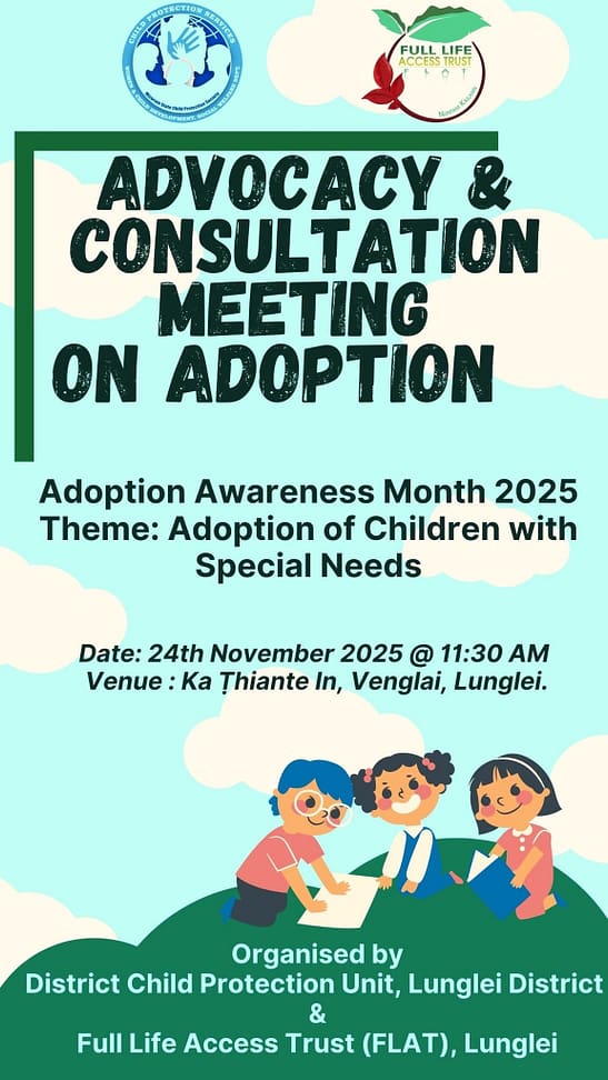 Vawiin dt. 24th.Nov.2025 hian District Child Protection Unit leh Full Life Access Trust ( FLAT ) Lunglei buatsaihin Ka Thiante In Venglai Lungleiah Advocacy & Consultation Meeting on Adoption hun hman a ni.